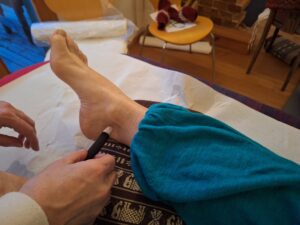 Unsere Gruppe beim Erwärmen von Akupunkturpunkten (Moxa) und bei der (Körperlich und psychisch) immunstärkenden Schröpfmassage am Rücken